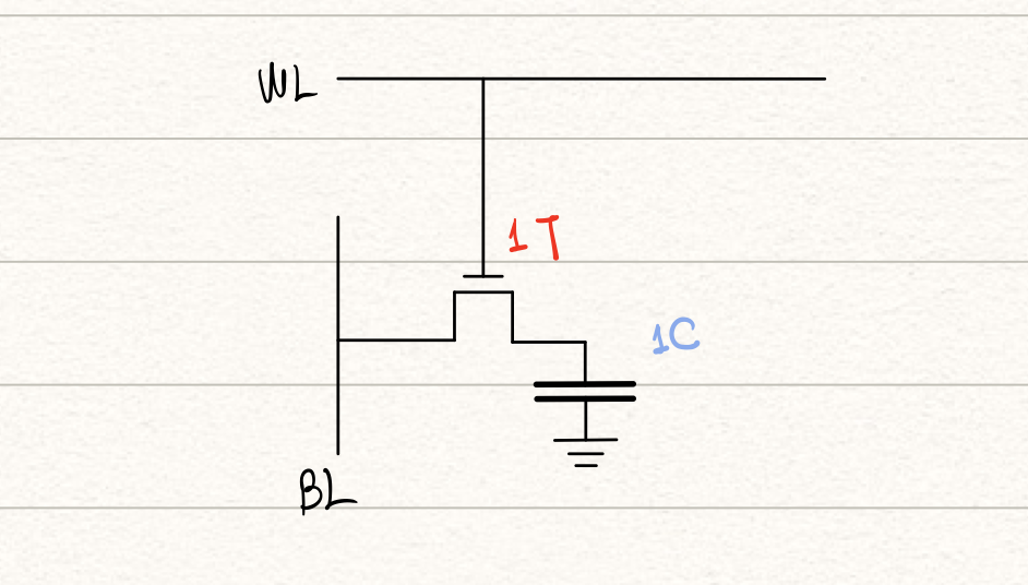 동적램이라고하여 IC 직접도가 SRAM에 비해 높기 때문에 용량은 크고 속도는 느리지만 비교적 가격이 저렴한 편입니다. DRAM의 1셀당 하나의 트랜지스터와 하나의 커패시터로 이루어져있으며 아래의 구조처럼 이루어져 있습니다.