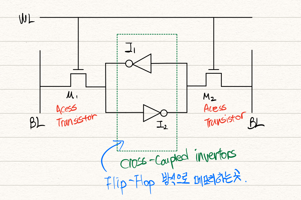 각 인버터는 2개의 Transistor를 가지므로 SRAM은 기본적으로 6T SRAM Cell이 되고 작동에는 3가지(¹hold, ²write, ³read)가 있습니다. 자세한 동작 원리가 궁금하신 분들은 추가 검색으로 참고 부탁드리며 간략하게 표현하면 Word Line이 0일 경우 hold, 1일 경우 write or read 동작을 수행하게 됩니다.