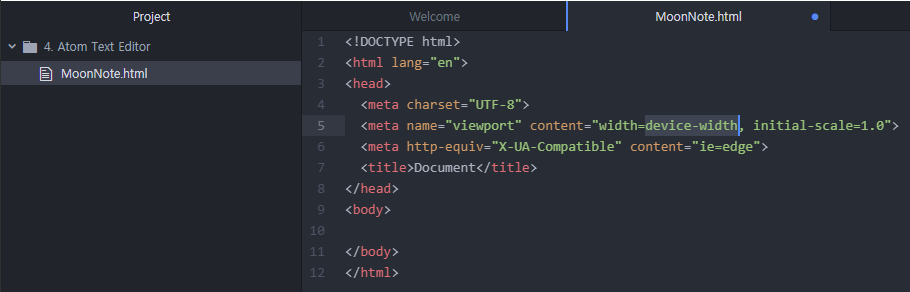 3개 패키기 설치가 완료되었다면 폴더 항목에서 우클릭 >> New File로 새파일을 만든다. 이름은 편하게 지정하고 html을 만들어보았다. 그럼 우측에 편집기에서 !를 입력하고 tab키를 누른다. 그러면 HTML 기본 틀이 자동으로 완성되는데 Emmet의 자동 완성 기능이 바로 이것이다.
