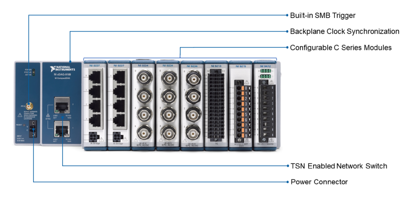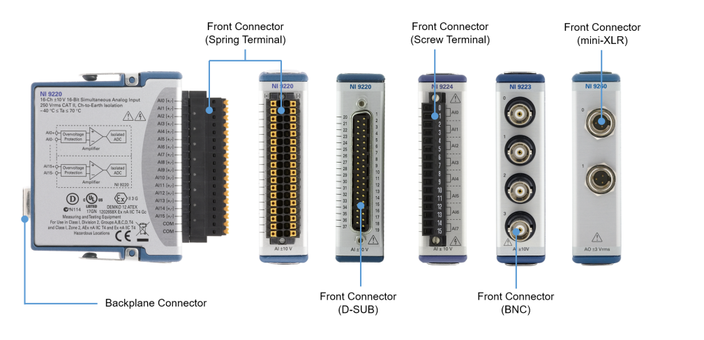 Compact 시리즈의 입력 또는 출력 모듈을 모두 통틀어 C 시리즈 모듈(C Series Module)이라고 부르는데요. C 시리즈 모듈은 Compact 섀시(Compact Chassis)에 장착하여 사용합니다. 기본적으로 C 시리즈 모듈에는 전압, 전류, 온도, 소음∙진동, 힘∙하중 측정 모듈 등이 있으며 일부 통신(CAN, LIN, Serial 등) 모듈도 있습니다.