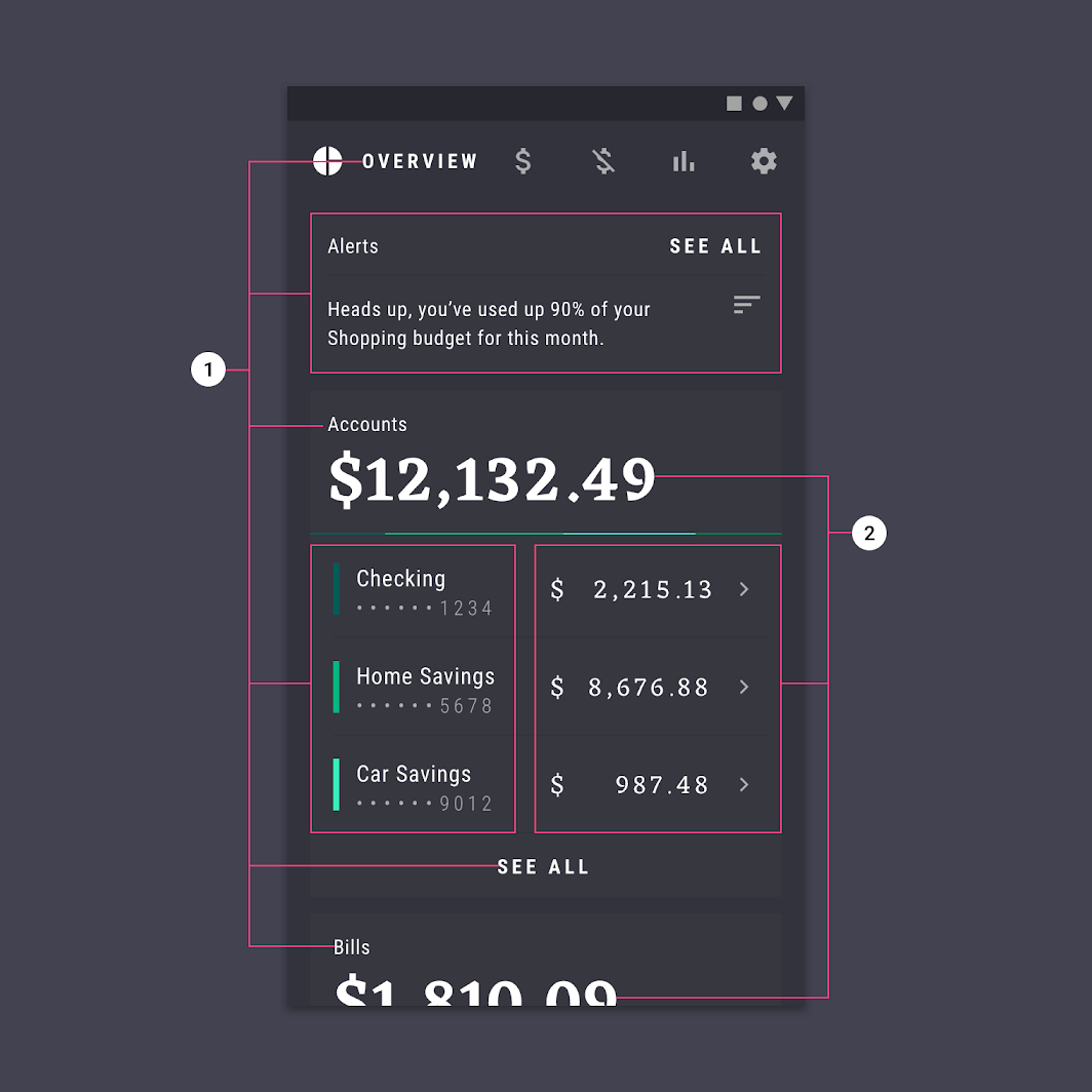이번 시간에는 Google 매터리얼 디자인 가이드에서 Rally 디자인에 대해 알아보고자 한다. 어떠한 내용을 다루고 개인적으로 알아두고자하는 부분을 정리해보고자 한다. 모든 이미지 자료 출처는 'Google Material Design'이다.