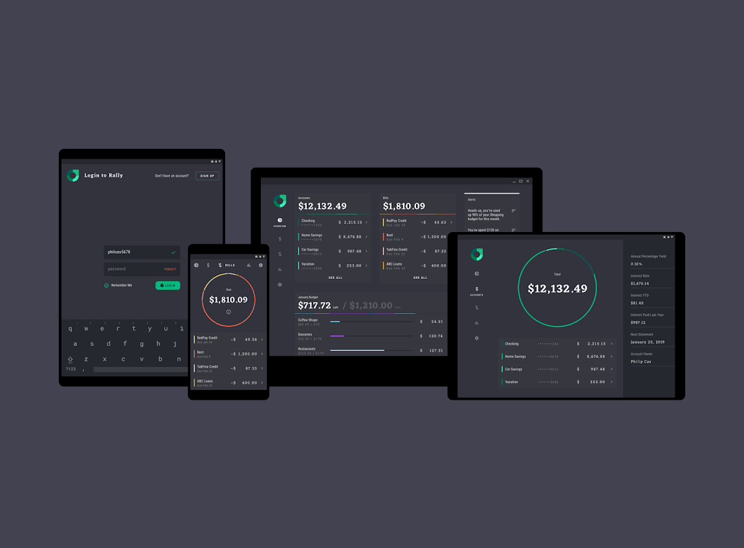 'Rally'는 Material Design Components와 Material Theming을 활용하여 데이터 중심의 심미성으로 브랜드 경험을 만드는 개인 금융 앱입니다.