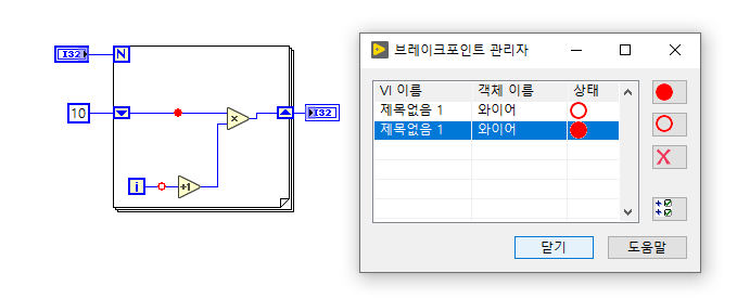 While Loop 안에서 빨간 테두리는 무엇을 나타내는지 물어보는 문제이다. LabVIEW 사용 경험이 있다면 바로 breakpoint 설정이라고 알고 있어야하는 문제이다. 정답은 3. The loop boundary has a breakpoint이고 LabVIEW에서 브레이크 포인트를 설정하는 방법은 크게 구조 브레이크 포인트, 노드 브레이크 포인트, 와이어 브레이크 포인트가 있다.
