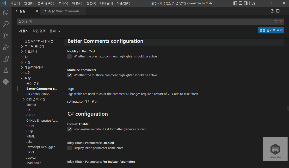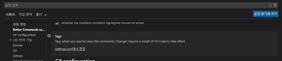 Extension 설치 후 VS Code에서 파일 >> 기본 설정 >> 설정(Ctrl + ,) 항목을 선택하고 확장 탭 에 보면 Better Comments Configuration이 있다.