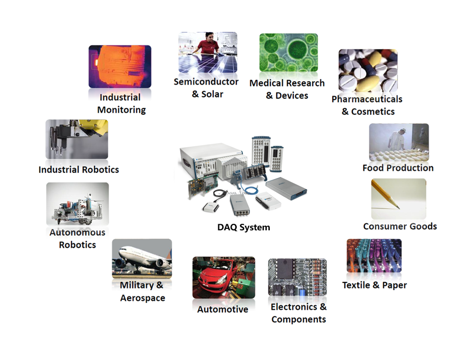 반도체, 의료,제약,국방⋅항공 우주, 자동차, 로봇, 식음료 등 제어 및 계측을필요로 하는모든 산업 분야에서 사용됩니다. 테스트, 계측 및 자동화 등 데이터 수집을 필요로 하는 모든 산업 분야에서 쓰이며 산업별로 다양한 솔루션과 그에 맞는 DAQ 하드웨어의 종류도 수천가지가 넘는다고 볼 수 있습니다. DAQ 시스템으로 대표적인 기업은 미국 오스틴에 본사를 두고 있는 National Instruments사가 있습니다. (그 외 HBM, Dewesoft, Advantech 등 DAQ를 취급하는 여러 회사가 있음)