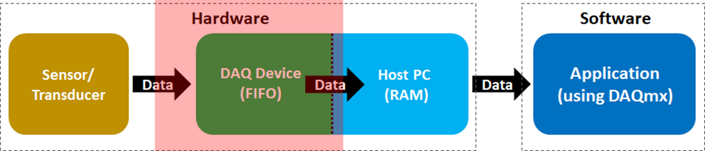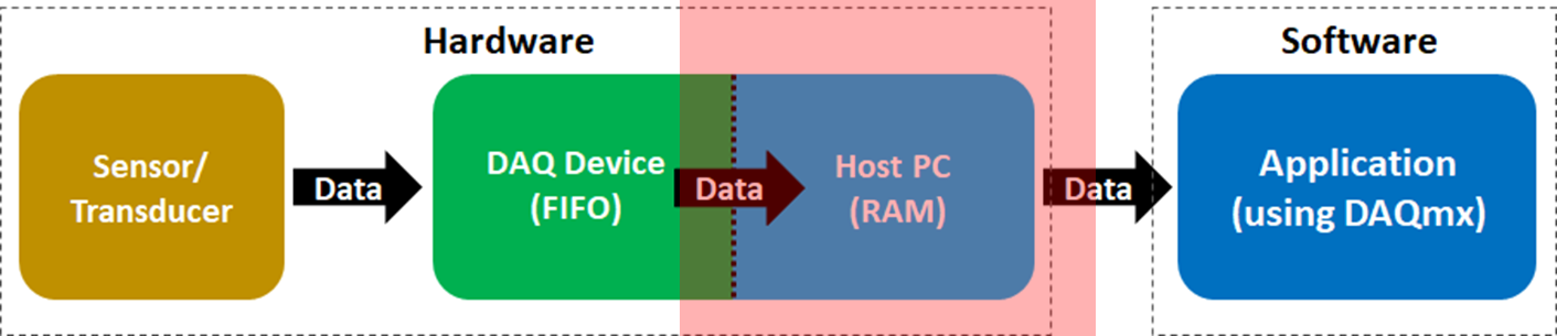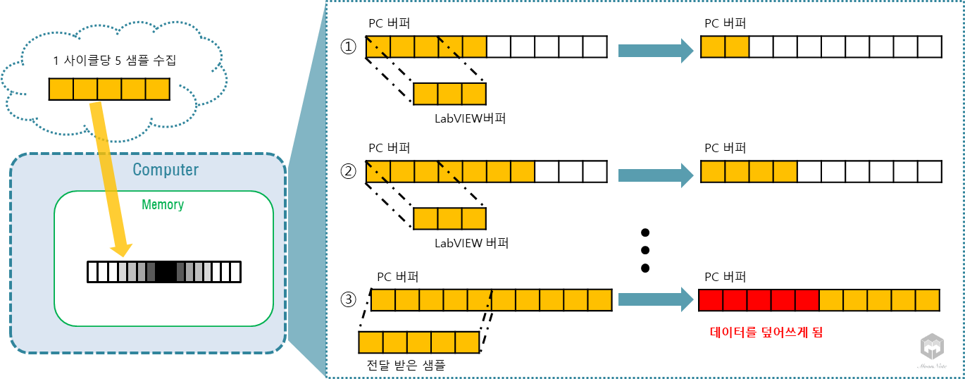 샘플링 과정에서 오버플로우와 관련하여 고려해볼 것은 ¹센서로부터 얼마의 빠르기로 샘플링하는지, ²디바이스 FIFO 버퍼의 데이터를 얼마나 빨리 PC쪽으로 빼가는지' 2가지입니다. 즉, 입력으로 들어오는 속도가 출력으로 빠져나가는 속도보다 빠를 경우 버퍼에 데이터가 쌓이게되고 언젠가는 '버퍼가 가득 찼다!'라고해서 오버플로우(Overflow)가 발생하는 것이죠.