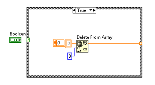 문제에서 보여주는 이미지처럼 코드가 작성되어있을 때 VI가 깨진 상태가 되는 이유를 물어보는 문제이다. "참" 케이스 안에 있는 [Delete From Array] 함수를 거쳐서 케이스 안쪽에서 바깥쪽으로 데이터를 전달해야하는 상황으로 함수 출력에서 나오는 값을 케이스 구조 경계와 와이어링 연결을 시켜준 상태이다.