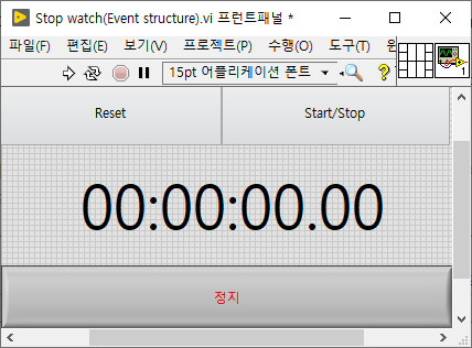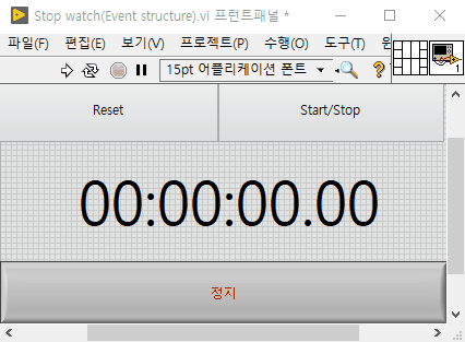 (#실행 화면) 실행해보면 정지 버튼이 제대로 작동하지 않습니다. 이벤트 구조를 처음 사용하면 한번쯤은 실수하는 경우인데요. 이벤트 구조의 타임 아웃 설정이 따로 되어있지 않아 '-1 = 무한정 기다림'으로 되어있어 while문 안의 이벤트 구조에서 멈춰있기에 실행 후 정지 버튼의 값을 읽을 수가 없는 것이죠. 실습해보신 분들이 계시다면 'Ctrl+.'키 또는 툴 바에서 강제 종료 버튼을 눌러서 VI를 멈춰주시면 되겠습니다.