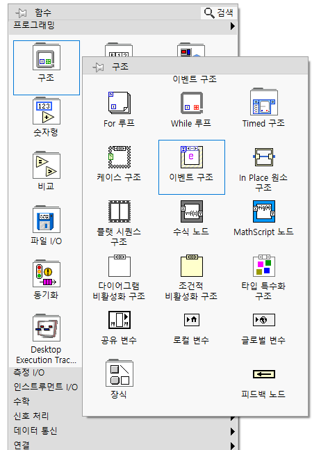 랩뷰에서 Event 구조는 함수 팔레트 >> 프로그래밍 >> 구조 >> 이벤트 구조를 선택하시면 생성할 수 있습니다.