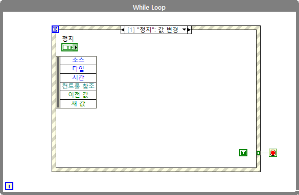 정지 버튼에 대한 이벤트 케이스가 생성되었다면 케이스 내에서 불리언 참(True) 상수를 통해서 조건 터미널과 와이어링 시켜줍니다. 앞으로 이벤트 구조를 사용하게 된다면 반드시 정지 기능에 대해서도 이벤트를 생성해주시면 되겠습니다.