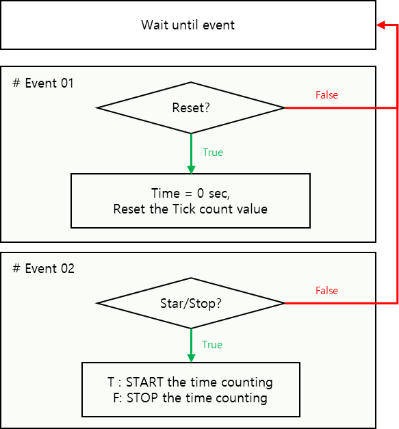 LabVIEW는 와이어링 기반의 코드 방식이라고 수차례 말씀 드린 것처럼 CASE 구조를 사용한 위의 코드처럼 실행할 경우, While Loop는 10ms마다 계속 돌아가면서 ¹Reset 버튼 값 확인, ²Start/Stop 값 확인의 순서로 작성된 코드를 실행하게 됩니다. 폴링(Polling) 방식의 프로그램인 것이죠. 차이를 조금이라도 더 이해하시길 바라는 마음으로 서론이 길었는데요..이벤트 구조를 사용한 프로그래밍 기법은 일종의 인터럽트(Interrupt) 방식이라고 할 수 있습니다. 비동기적인 특성을 가진 기능 구현만 설정하면 되는 것이죠. 스탑 워치 기능으로 본다면 아래의 이미지와 같겠네요. Event 타임도 걸 수 있지만 기본 '무한정 기다림' 동작으로 보았을 때 Flow Chart입니다.