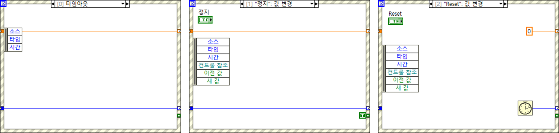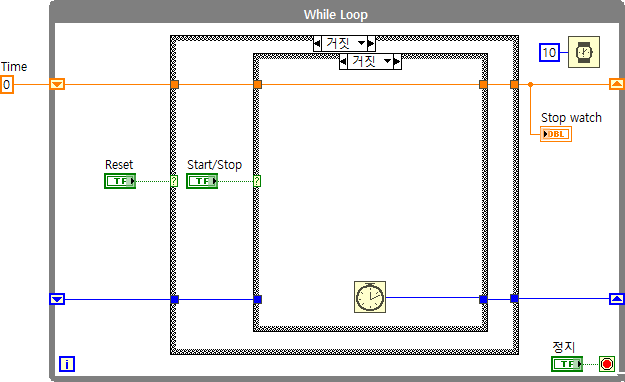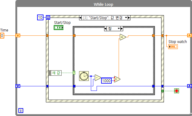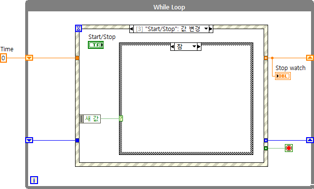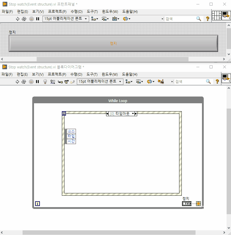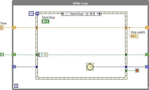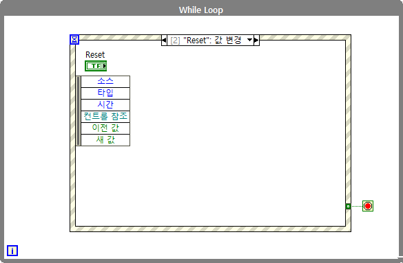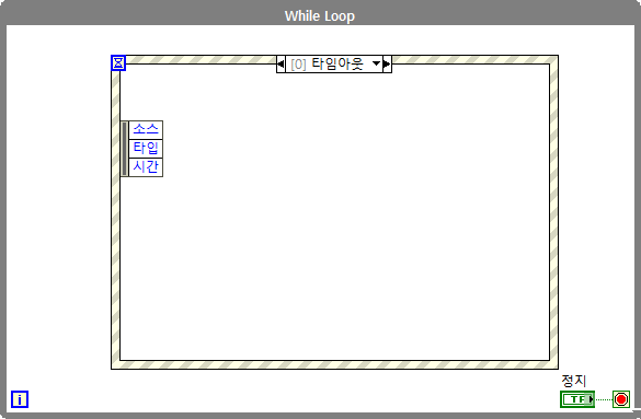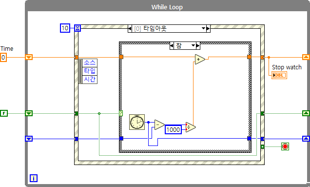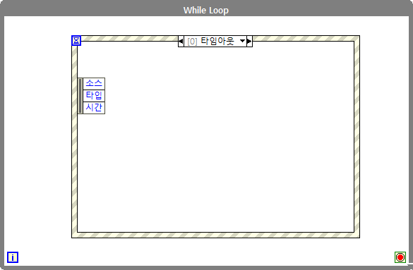 (#추가 설명) 지금처럼 프로그램 조건에 따라서 while루프를 계속 돌려야하는 경우 타임 아웃을 설정하여 루프를 계속 실행시켜주어야합니다. 이벤트 구조에서 '타임 아웃' 케이스가 반드시 필요한 이유라고도 할 수 있는데, 이벤트 구조 생성시 '타임 아웃' 케이스가 기본적으로 생성되는 이유는 이러한 타임 아웃 설정에서 발생할 수 있는 에러에 대한 경우의 수를 줄이고자 반드시 들어가는 것이므로 사용하지 않더라도 케이스를 삭제하지 않도록 주의합니다. LabVIEW 이벤트 구조에서 '타임 아웃' 케이스가 없으면 실행이 안되게 막아둔 이유도 이와 같은 이유에서입니다.