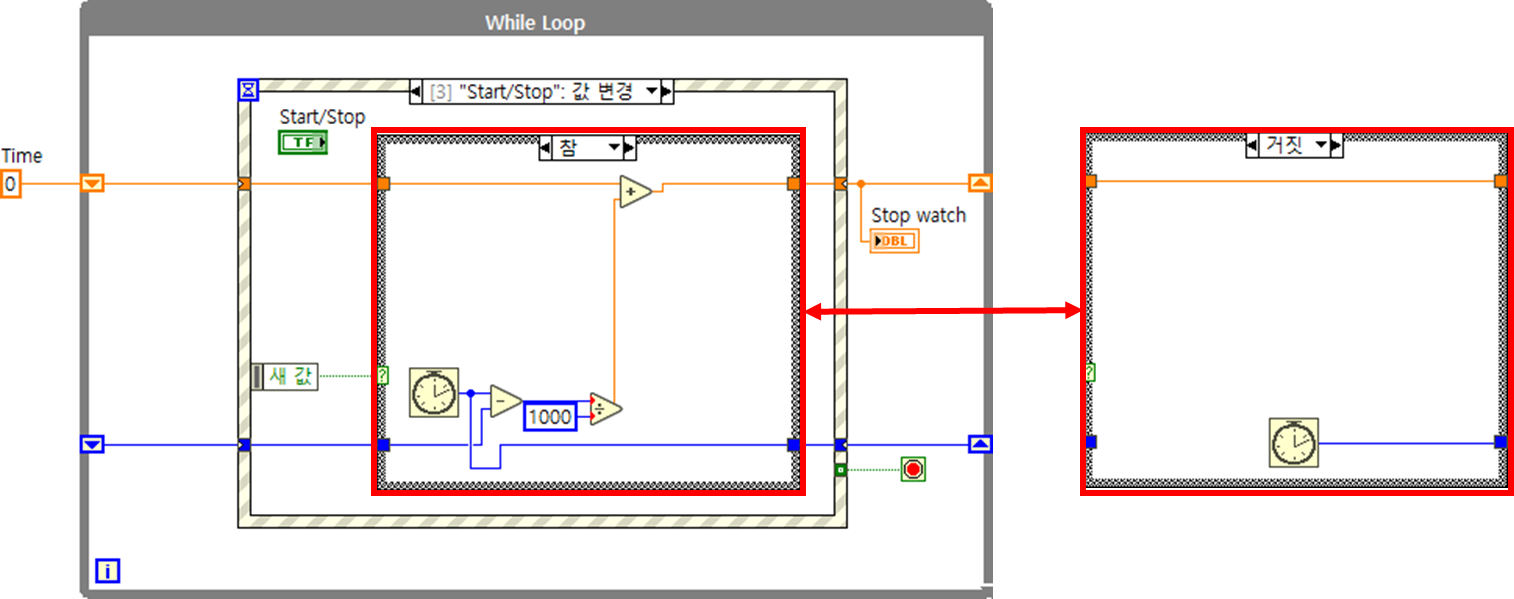 10. 이제 코드 작성이 끝났으므로 VI를 실행(Ctrl+R)시켜 봅니다. 제일 처음 설명드렸던 Flow Chart에서 Start 버튼을 누르면? 시간이 카운팅되어야하는데 카운팅 되지 않는 현상이 발생할겁니다. 실행 이미지와 Flow Chart에서 표시한 부분을 참고하시기 쉽게 다시 정리해서 첨부드리겠습니다.