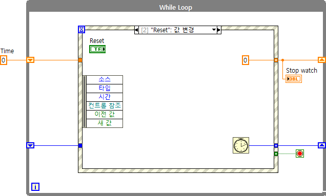 6. While 루프에서 Shift Register를 하나 생성하고 Reset 버튼 이벤트 케이스에 경과 시간 체크를 위한 [Tick 카운트]와 디스플레이를 위한 타이머 값을 0로 다시 초기화 시켜주는 코드를 아래와 같이 만듭니다. (Tutorial 16에서 만들었던 기능들)