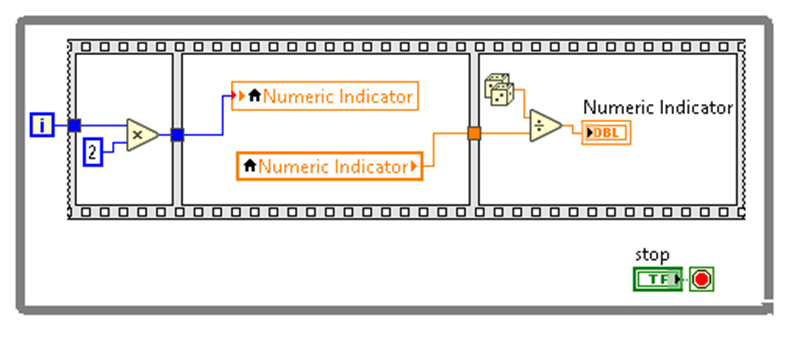 VI가 실행될 때 경합 조건(Race Condition)이 발생하는 이유를 물어보는 문제이다. 경합 조건이란 두 객체 간 따로 의존성이 없다라는 의미로 와이어링 기반의 LabVIEW에서는 와이어의 흐름에 따라 실행 순서가 결정되는데, 따로 와이어링이 되어있지 않다면 어떤 변수 또는 노드가 실행될지 알 수 없다. 위의 코드에서 시퀀스 구조 및 와이어링으로 실행 순서를 지정해주었지만 'Numeric Indicator' 변수의 읽기와 쓰기 간 따로 와이어링이 되어있지 않기 때문에 2번째 시퀀스 프레임에서 실행될 때마다 다음 2가지 경우 중 하나가 실행된다고 생각할 수 있다. 1 : 변수 쓰기 먼저 실행 후 읽기 2 : 변수 읽기 먼저 실행 후 쓰기