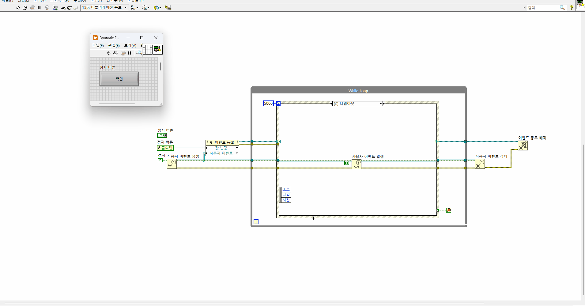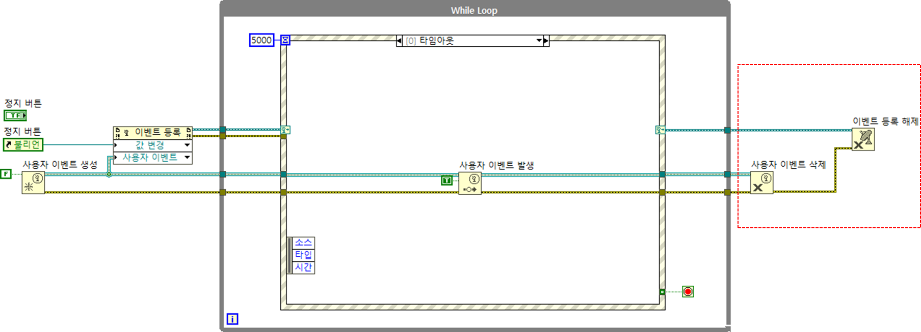 자 이제 코드 실행과 관련된 작성은 모두 끝났습니다. 나머지 부분은 크리티컬하진 않으나 VI가 실행을 마치고나면 기존의 LabVIEW에서 할당하여 잡고있던 참조 리소스들을 메모리에서 지워주기 위해 [사용자 이벤트 삭제]와 [이벤트 등록 해제] 노드를 이용하여 깔끔하게 지워주도록 합니다.
