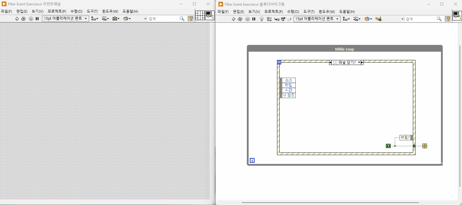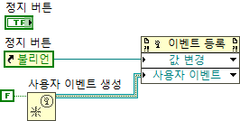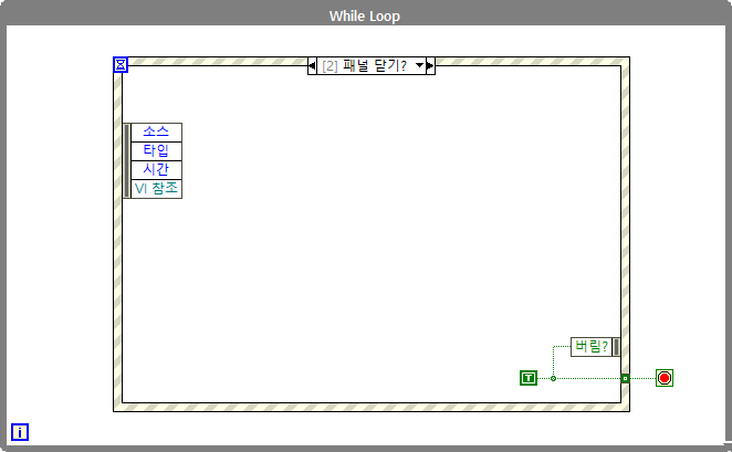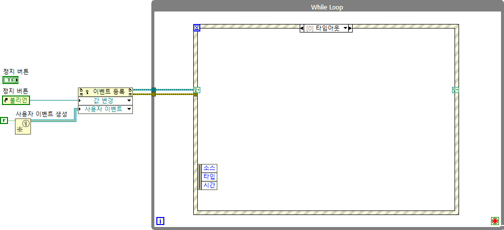 알림 이벤트의 경우 패널 닫기 이벤트 발생 시 이벤트 케이스 구조 안의 코드와 패널 닫기 동작이 바로 실행됩니다. 즉, 윈도우 창이 닫혀버리는거죠. 필터 이벤트의 경우 이벤트가 발생하여도 코드 및 동작 수행 전 이벤트 필터 노드에 의해 이벤트 데이터를 한번 식별하는 것이죠. 위의 이미지에 보이는 '버림?'이라는 이벤트 필터 노드에 True 값을 설정하게되면 패널 닫기 버튼(X 표시 버튼)을 눌러도 기본 동작을 버림 처리하였기 때문에 창이 닫히지 않게 됩니다. While문에 이벤트 구조를 사용한 아래의 코드를 예시로 돌려보겠습니다.