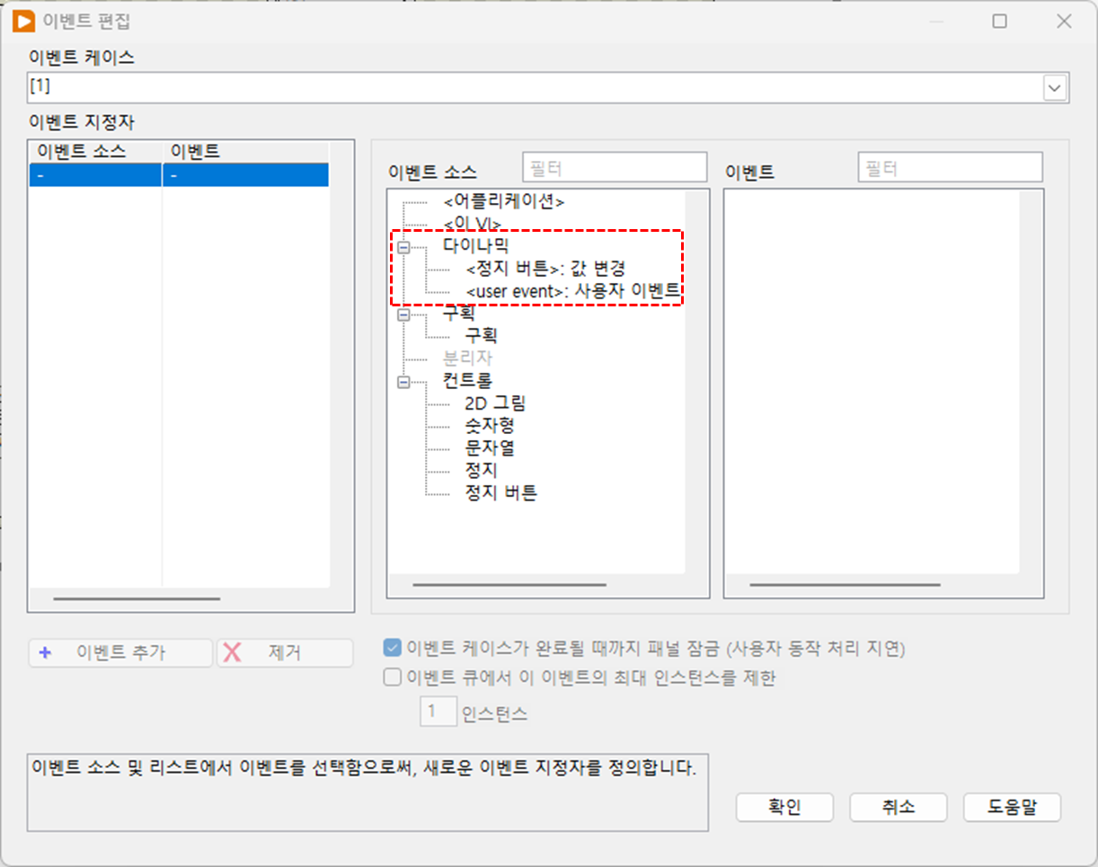 다이나믹 이벤트 추가 (#Event1 : 정지 버튼 '값 변경', #Event2 : 사용자 이벤트)