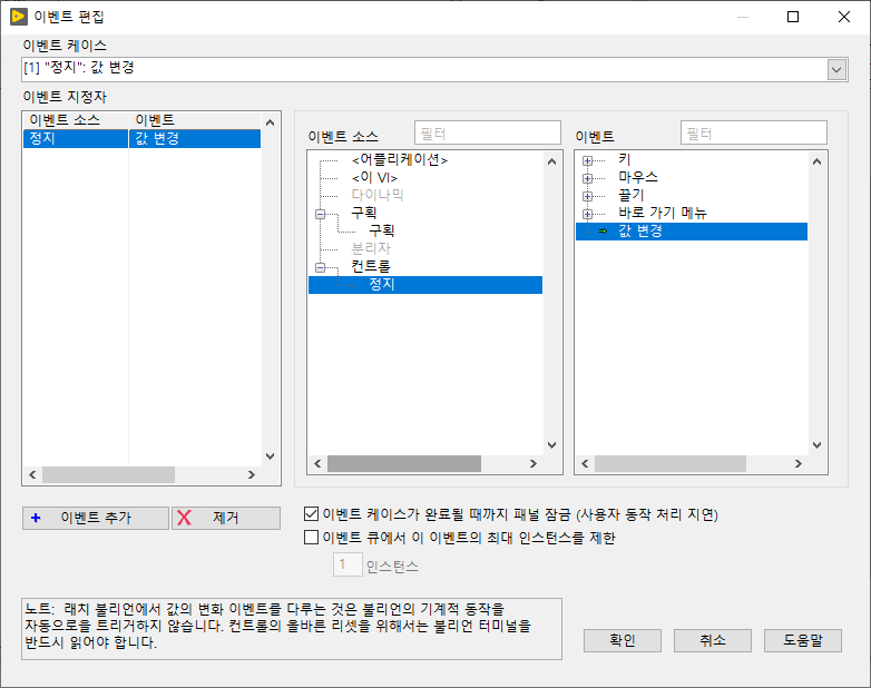 알림 : 알림 이벤트는 사용자 작업이 발생했다는 것을 알립니다. 필터 : 필터 이벤트를 사용하면, LabVIEW가 해당 이벤트와 연계된 기본 동작을 수행하기 전에 사용자가 이벤트 데이터를 검증하거나 변경할 수 있습니다. 또한 변경 사항이 VI에 영향을 주는 것을 방지하려면 이벤트 전체를 무시할 수 있습니다.