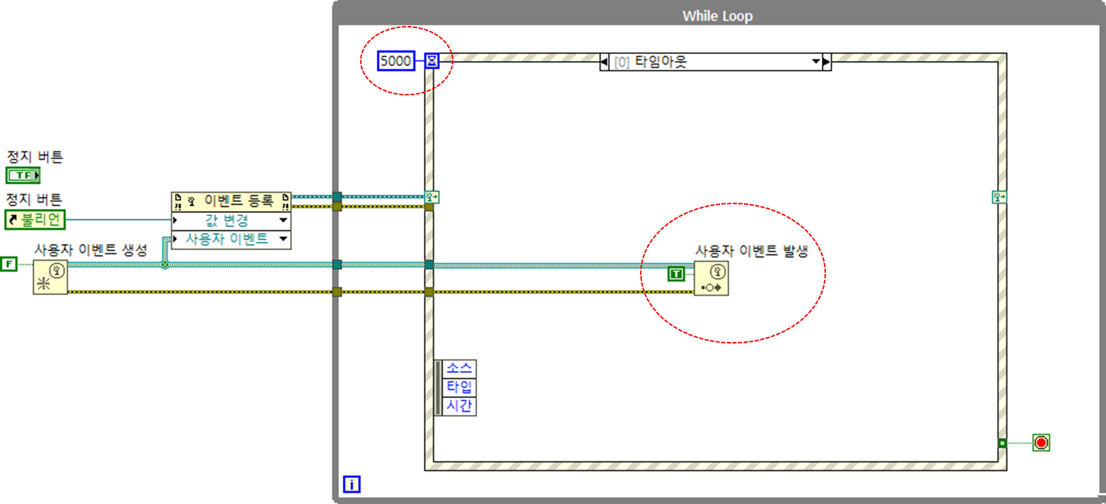 그리고나서 이벤트 구조에 타임 아웃 5초를 설정하여 타임 아웃시 사용자 이벤트를 발생시켜보는 코드를 작성해보겠습니다. [사용자 이벤트 발생] 노드는 이벤트 등록 노드와 동일하게 함수 팔레트 >> 대화 상자 & 이벤트 케이스 >> 이벤트 >> 사용자 이벤트 발생에 있습니다.