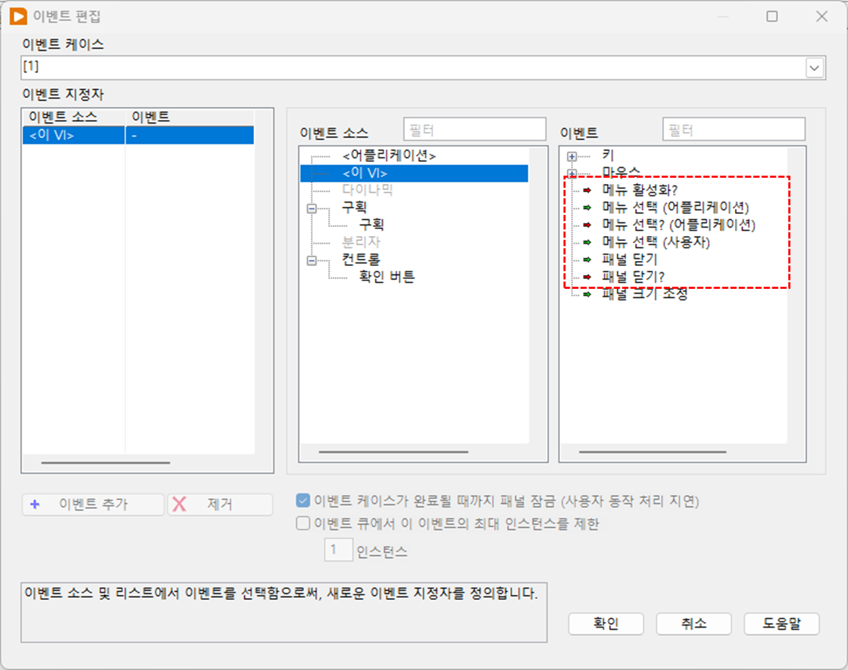 위의 내용을 요약해보자면 알림 이벤트의 경우 이벤트 발생 시 바로 기본 동작을 수행하고 필터 이벤트의 경우 동작 수행 전 한 번의 검증 또는 변경이 가능하도록 말 그대로 필터링 처리를 하는 것입니다. 랩뷰 코드로 한번 살펴보겠습니다. 이벤트 구조를 하나 생성하여 '패널 닫기'(알림 이벤트)와 '패널 닫기?'(필터 이벤트) 이벤트를 추가합니다. 그러고나서 두 이벤트 케이스를 비교해보면 필터 이벤트 같은 경우 우측에 이벤트 필터 노드가 있는 것을 보실 수 있습니다.