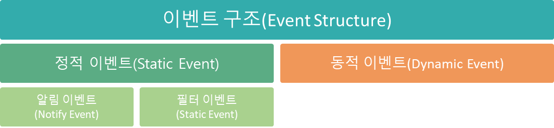 이벤트 구조는 크게 정적 이벤트(Static Event)와 동적 이벤트(Dynamic Event)로 나뉘어집니다. 일반적으로 많이 사용하는 이벤트 구조 기능은 바로 정적 이벤트(Static Event)입니다. 정적 이벤트도 내부적으로 알림 이벤트(Notify Event)와 필터 이벤트(Filter Event)로 세분화 되는데 이해를 돕기 위해 이미지로 한번 표현해 보았습니다.