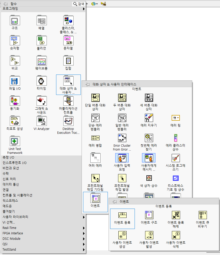 동적이란 정적과는 반대의 개념으로 계속해서 변하는 성질을 말합니다. 즉, 특정 상황에서만 발생하는 이벤트를 사용자가 다이나믹하게 설정할 수 있는데요. LabVIEW에서는 블록다이어그램 [이벤트 등록] 노드를 사용하여 출력되는 다이나믹 이벤트 참조를 이벤트 구조에 연결해서 사용해야 합니다. [이벤트 등록] 노드는 함수 팔레트 >> 대화 상자 & 이벤트 케이스 >> 이벤트 >> 이벤트 등록에 위치해 있습니다.