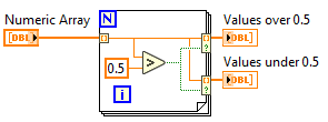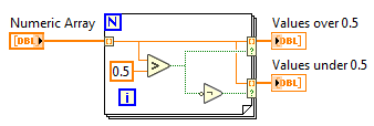 AutoIndexing을 통하여 0.5보다 넘는 값과 0.5보다 낮은 값을 각각 분리하는 코드를 찾는 문제이다. 먼저 0.5보다 큰 값과 0.5보다 낮은 값에 대해 각각 비교하는 코드는 3번과 4번이 되겠다. 비교 연산자 후 not 게이트가 적용된 와이어와 적용되지않은 와이어가 사용된 코드를 찾으면 된다. 그 다음 출력 터미널에 조건적 설정을 통하여 0.5가 넘는 값과 0.5보다 작은 값을 출력으로 AutoIndexing하는 코드를 찾으면 3번이 정답이다.