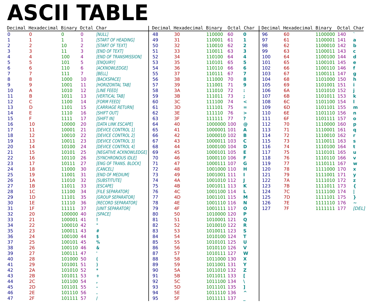 위키백과를 참조하면 기호의 순차 수열이라고 설명하고 있는데 쉽게 설명하면 말 그대로 문자들의 열을 말합니다. 예를 들어 'H'는 문자지만, 'Hello'는 문자열이라고 할 수 있는 것이죠. 스트링(String)이라고 많이들 부르며 str로 줄여서 표기하기도 합니다. 문자마다 PC가 이해할 수 있도록 고유의 이진 값(0 or 1)이 있는데 이해를 돕기 위해 대표적인 ASCII 코드표를 첨부하였으니 참고하시면 좋을 듯 합니다.
