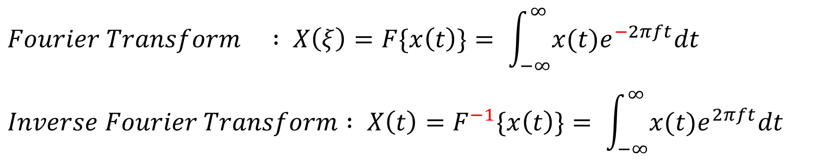 푸리에 변환과 푸리에 역변환은 서로 \(x(t)\leftarrow F\rightarrow x(f)\) 관계를 가지는데 수식으로 비교해보면 아래와 같이 나타내고 있습니다.