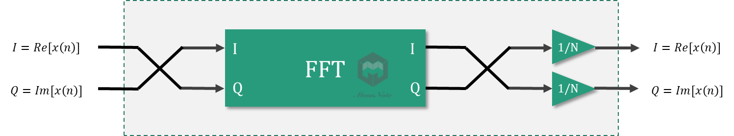 IDFT 수식 Key point는 1) N등분, 2) DFT와 지수함수의 부호가 반대라는 점입니다. 블록도로 그려보면 다음과 같이 IFFT 회로를 표현할 수 있습니다.