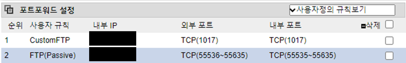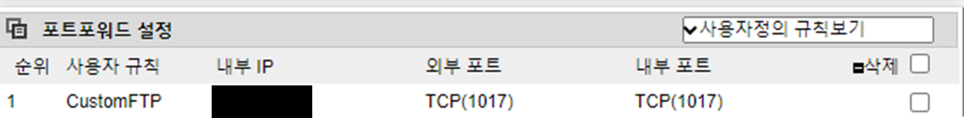 마지막으로 라우터 구성 탭에서 FTP 포트 설정을 추가합니다. 기본 21번 포트를 사용할 경우 '내장 응용 프로그램'에서 FTP 선택 후 추가하고 '사용자 지정 포트'의 경우 기본 설정에서 FTP 포트를 기본 값 외 설정하였다면 선택하여 지정한 포트 번호를 직접 입력시켜 주도록 합니다. 본문에서는 1017번 포트를 사용하였으므로 아래와 같이 직접 포트를 추가시켰습니다.