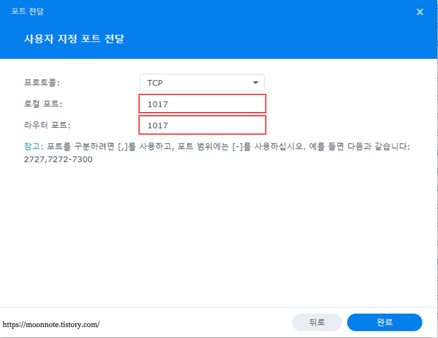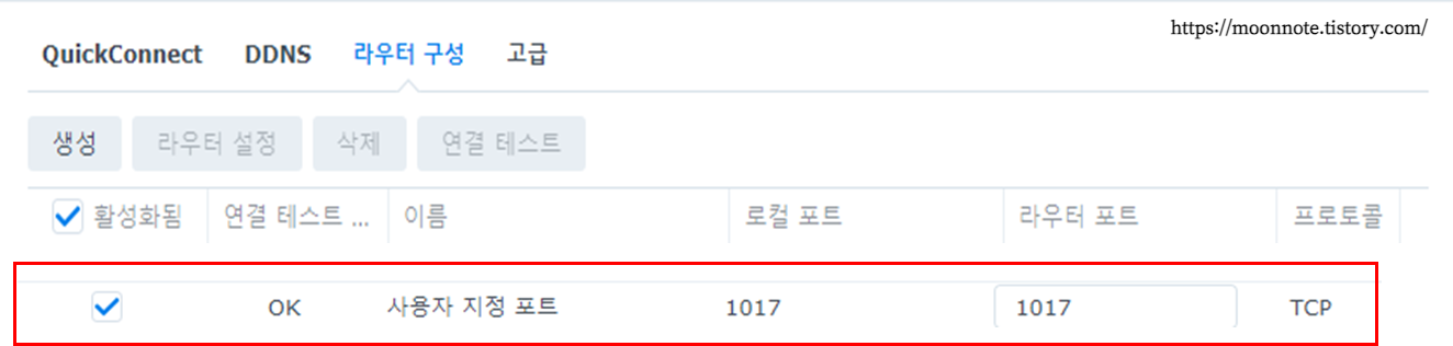 2. 포트포워드 설정에 사용할 FTP 1017 포트를 추가(NAS에서 기본 FTP 포트 설정을 그대로 사용하였다면 21번 포트 적용)