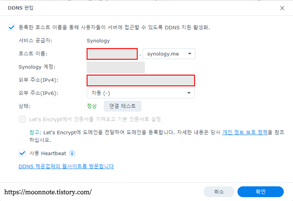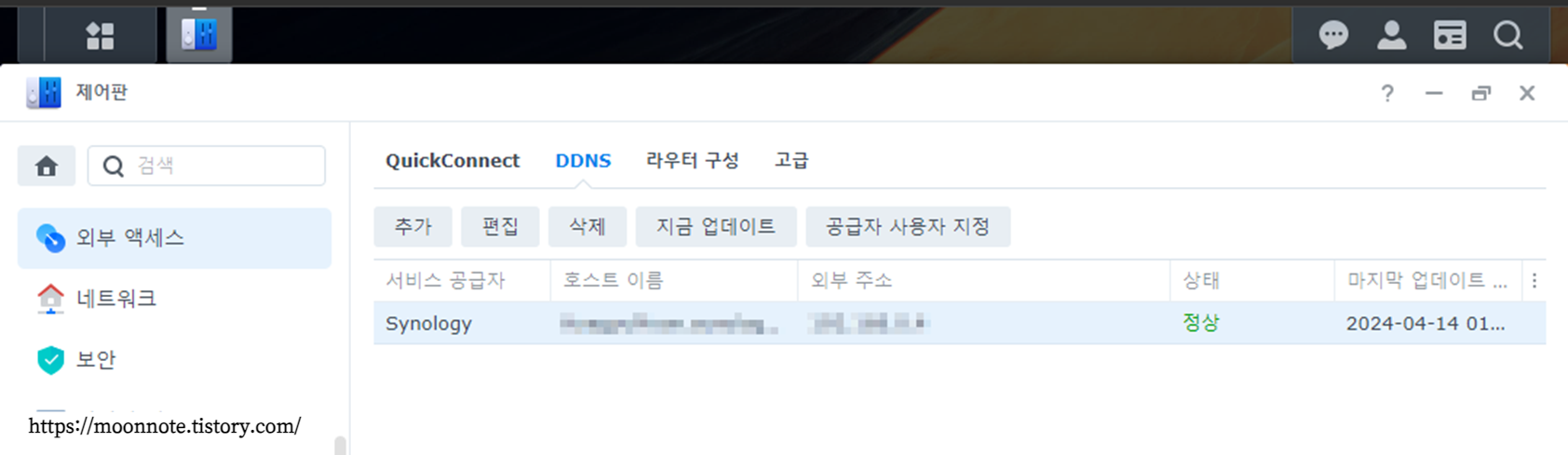 제어판 >> 외부 액세스에서 DDNS 및 라우터 구성을 시켜주어야 합니다. 먼저 DDNS 탭에서 사용할 DDNS를 설정합니다.