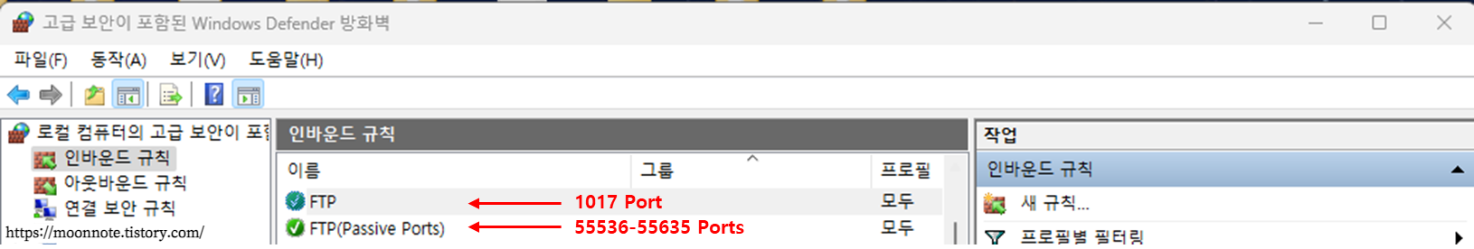 PC 방화벽 설정에 따라 FTP 접속이 제한되는 경우들도 있습니다. 따라서, 방화벽 인바운드 규칙에 FTP 포트를 지정하여 에러 케이스를 줄여주도록 합니다.
