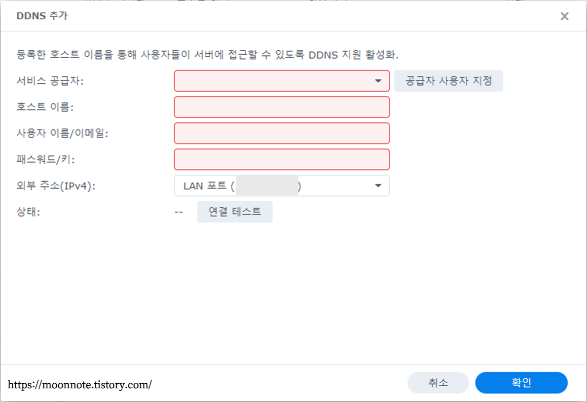 추가 버튼을 눌러 '서비스 공급자:Synology', '호스트 이름:XXXX[원하는 값 지정])', '사용자 이름/이메일:[이메일 주소]', '패스워드/키:[패스워드 입력]', '외부 주소(IPv4):LAN 포트(XXX.XXX.XXX.XXX)'를 통해 신규 DDNS를 생성합니다.
