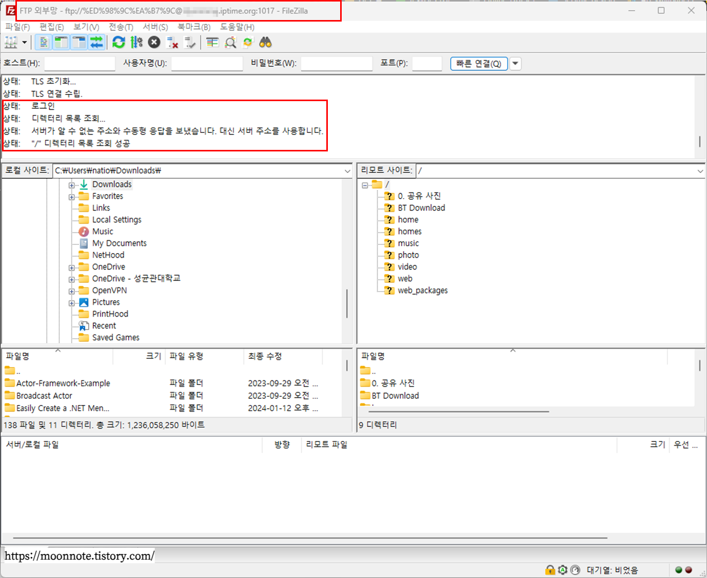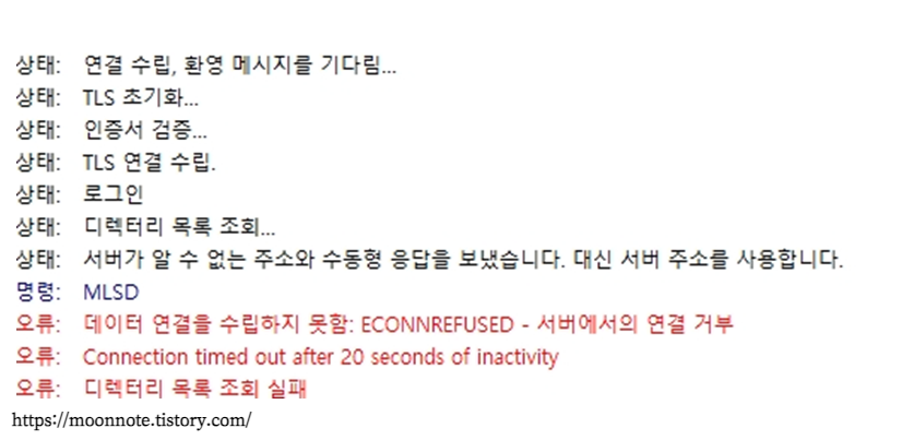 PC마다 보안 앱 및 방화벽 차이로 결과가 다를 수 있으나 외부망에서 똑같이 FTP 접속을 시도하면 아래와 같은 "서버가 알 수 없는 주소와 수동형 응답을 보냈습니다. 대신 서버 주소를 사용합니다."라는 메시지 이후 PC의 방화벽 FTP 포트 허용 및 공유기 포트 포워딩을 완료한 상태임에도 디렉토리 스캔이 불가한 상황 발생할 수 있습니다.