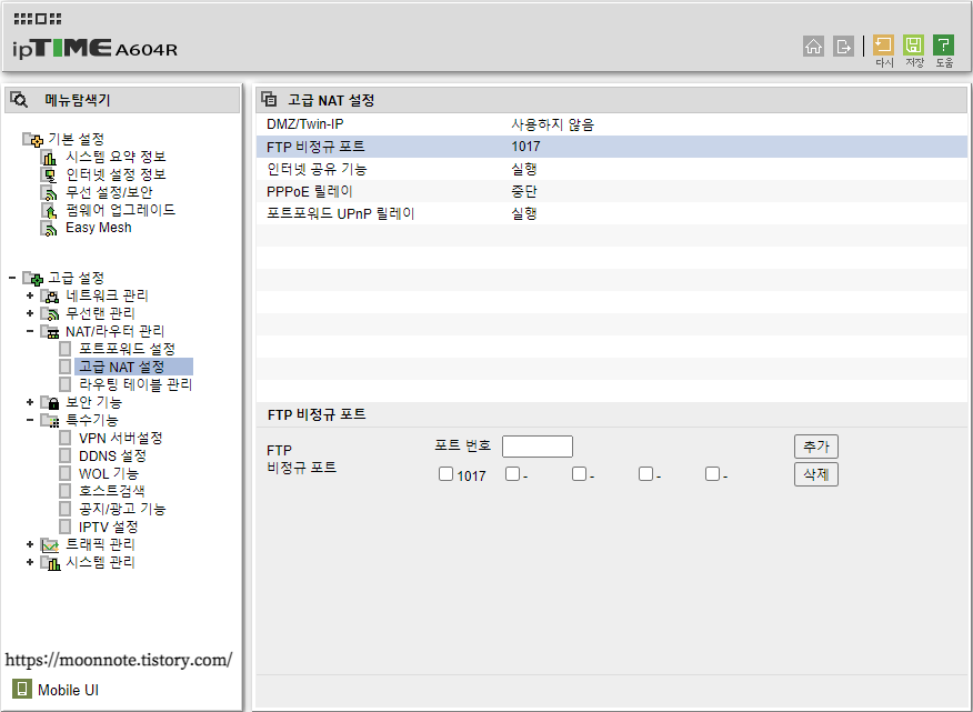 다음으로 외부에서 FTP 접속을 하기 위해 사용하고 있는 공유기의 포트 포워딩을 해주셔야 합니다. 공유기마다 설정이 조금 차이가 있기에 자세한 내용은 공유기 모델의 구글링을 해보시고 본문에서는 ipTIME A604R 모델 기준으로 참조 이미지를 첨부하여 설명드립니다.