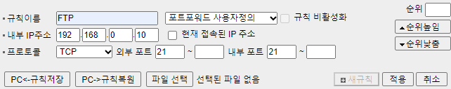 새규칙 적용시 아래와 같은 예시 이미지처럼 입력 창에 '규칙 이름:[이름 지정]', '내부 IP주소:[NAS IP 주소]', '프로토콜:TCP', '외부 포트:[FTP 포트 번호]', '내부 포트:[FTP 포트 번호]'를 입력하고 적용 버튼을 눌러 추가합니다.