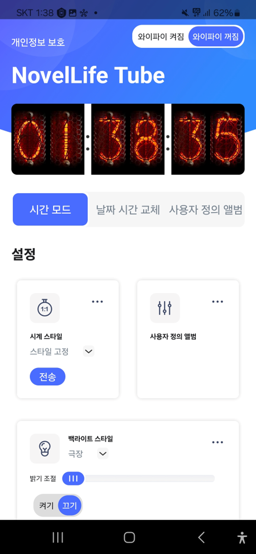 App을 실행시키면 화면에서 시계 스타일, 사용자 정의 앨범, 백라이트 옵션에 대해 설정이 가능하다.