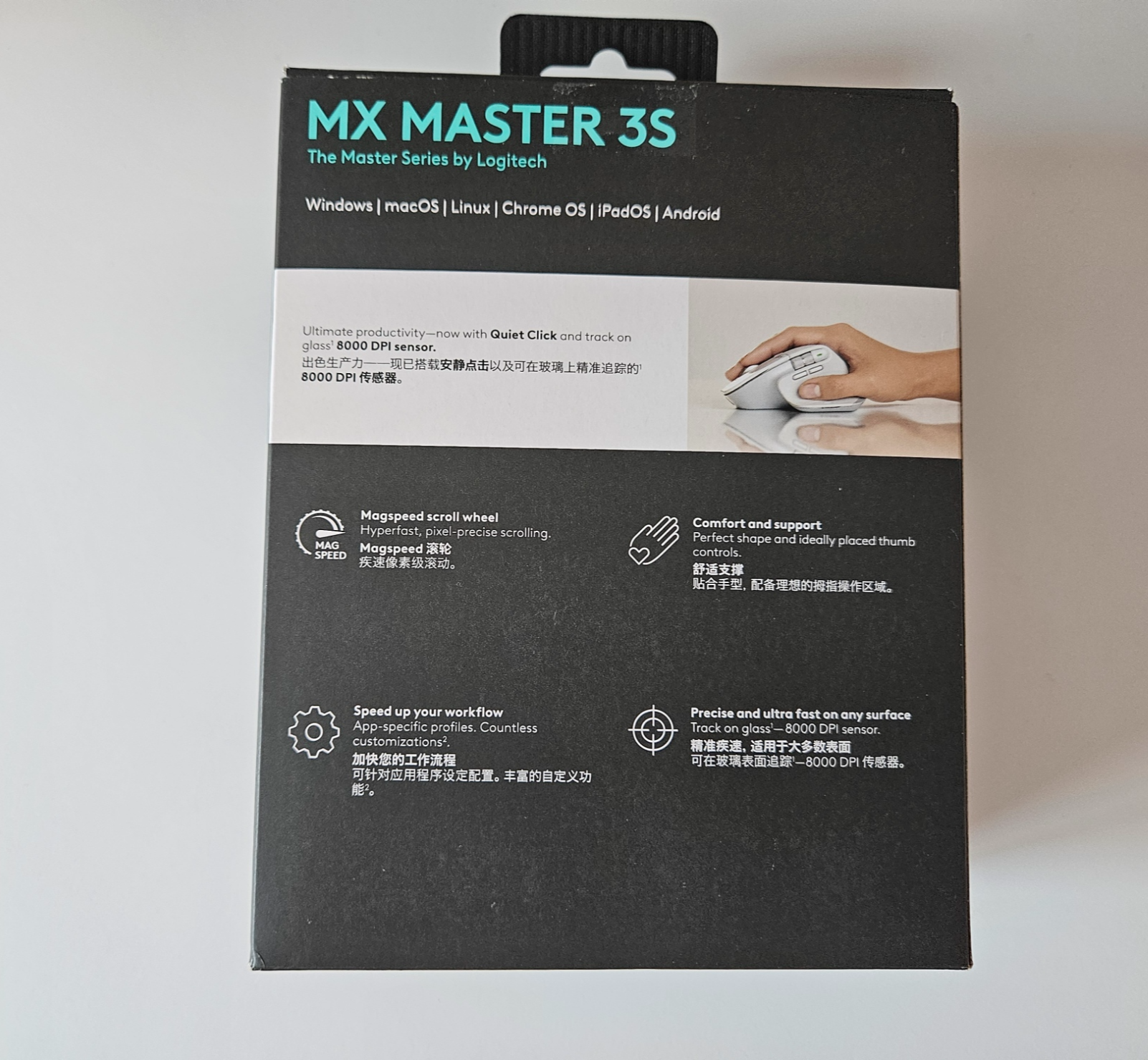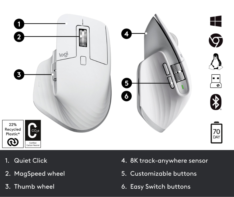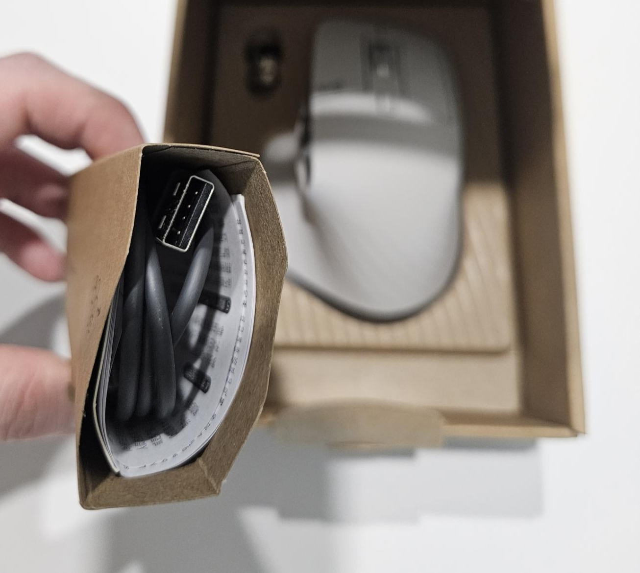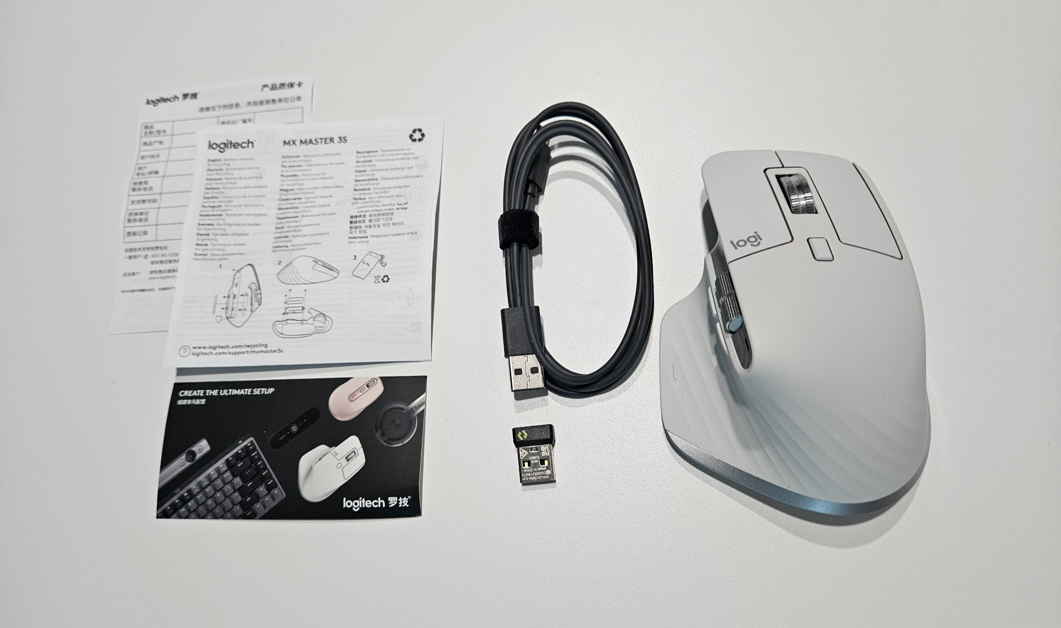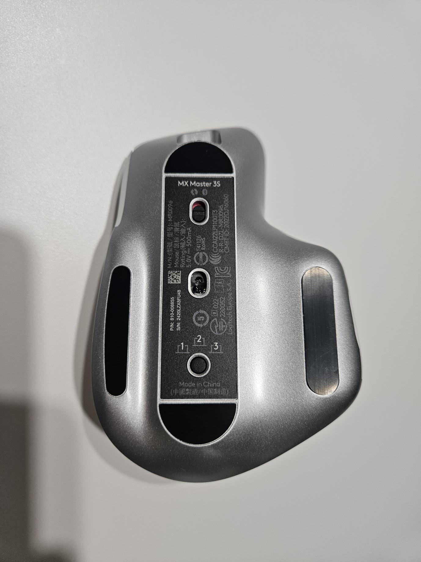 위의 이미지처럼 속박스를 열어보면 Logi bolt, MX Master 3S 마우스, 그리고 USB 케이블(A to C)로 구성되어 있다. 이전에 MX Master 2S를 사용하고 있었는데 2S에 비하면 그립감이 좀 더 컴팩트해진 느낌이다.