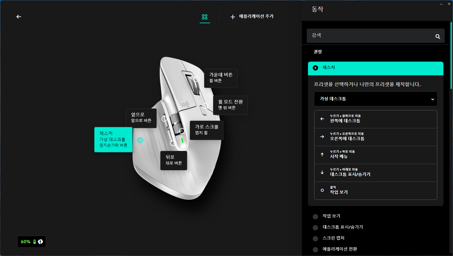 다음으로 Logitech에서 제공하는 Logi Option+ 앱을 통하여 커스터마이징한 마우스 설정을 할 수 있다.