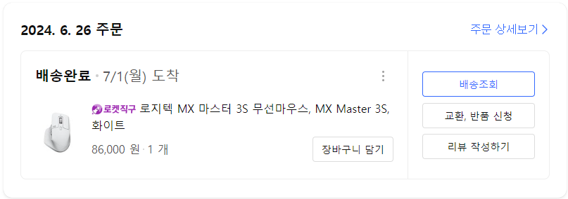 얼마 전 쿠팡에서 와우 쿠폰 할인가로 저렴하게? 마우스를 하나 구매할 수 있어 사무용품 필수템이라고 불리우는 MX Master 3S를 구매하였다. 기존에 이전 버전이던 MX Master 2S(블랙)을 사용하고 있어 3S도 관심을 가졌었는데,,원래 12~13만원?정도는 했던 것 같은데....(정확하지 않음 😅) 8만원대면 괜찮게 구매한 것 아닌가해서 바로 주문!! 직구인데도 빨리 물품이 도착하였다. 역시 쿠팡...