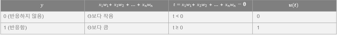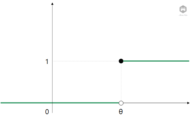 이처럼 0보다 작은 실수에 대해서는 0, 0보다 큰 실수에 대해서는 1을 갖는 함수를 우리는 '단위 계단 함수'라고 부르고 있습니다.