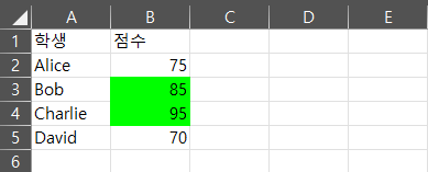 # 조건부 서식 규칙 설정: 점수가 80 이상일 때 셀 배경을 초록색으로 변경