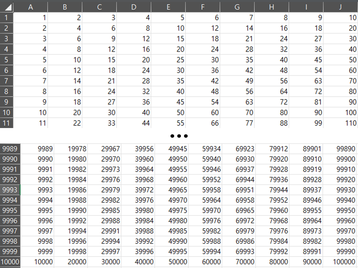 ws.append([i, i * 2, i * 3, i * 4, i * 5, i * 6, i * 7, i * 8, i * 9, i * 10])