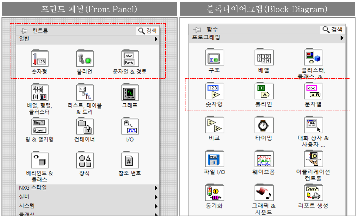 프런트 패널의 경우 컨트롤 팔레트 >> 일반 항목에서, 블록다이어그램의 경우 함수 팔레트 >> 프로그래밍 항목에서 기본 데이터 타입(숫자, 불리언, 문자열)과 관련된 객체 또는 함수들을 찾을 수 있습니다.