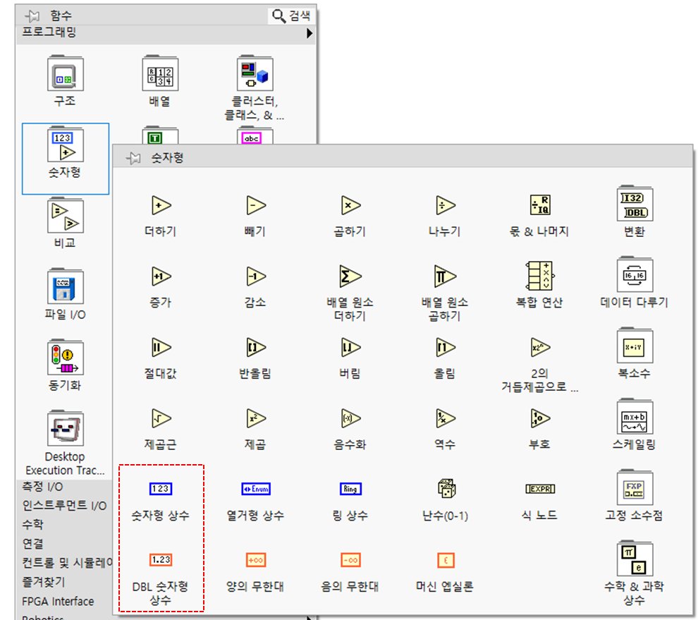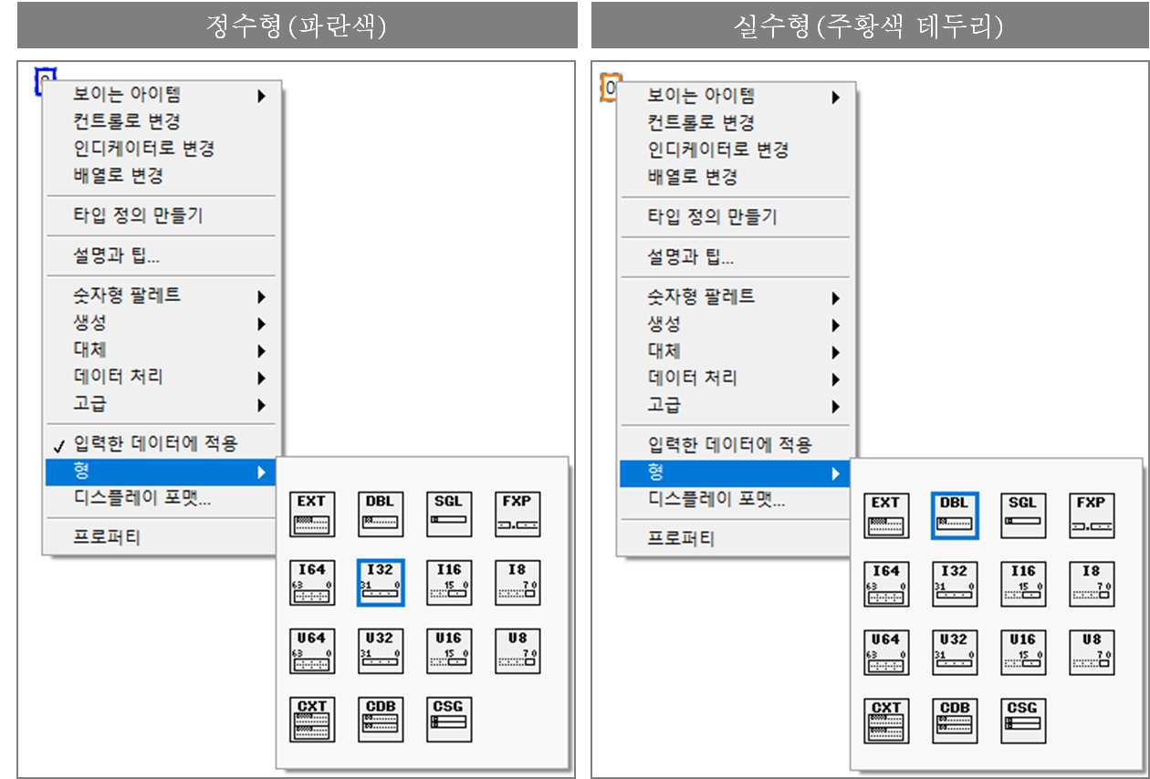 블록다이어그램에서 파란색 테두리 상수를 가지고 올 경우 기본 데이터형은 I32(int32), 주황색 테두리 상수를 가지고 올 경우 데이터형은 DBL(double)로 지정되어있습니다. 숫자형 타입의 경우 우클릭 메뉴에서 사용자가 원하는 데이터형으로 변경 또는 현재 지정되어있는 데이터형을 확인하실 수 있습니다.