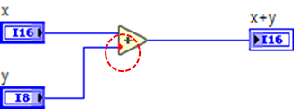 [더하기] 함수 입력 터미널 X와 Y에 각각 I16과 I8 컨트롤을 연결해주면 I8쪽에 연결된 터미널에 강제 변환점이 생성된 것을 확인할 수 있습니다. 동일한 숫자형이지만 서로 다른 두 데이터를 연산하는 과정에서 데이터 크기가 더 큰 타입으로 자동으로 변환되는 것이죠. 만약 출력 값이 I8로 변환되고 강제 변환점도 출력 타입에 맞추어 I16이 I8로 변경된다고 생각해보면 코드가 범할 수 있는 오류 사항으로 I8이 표현할 수 있는 127보다 높은 숫자는 표현이 안되기에 LabVIEW에서 자동으로 크기가 작은 데이터를 큰 데이터 타입으로 변환시켜버리는 것이죠.