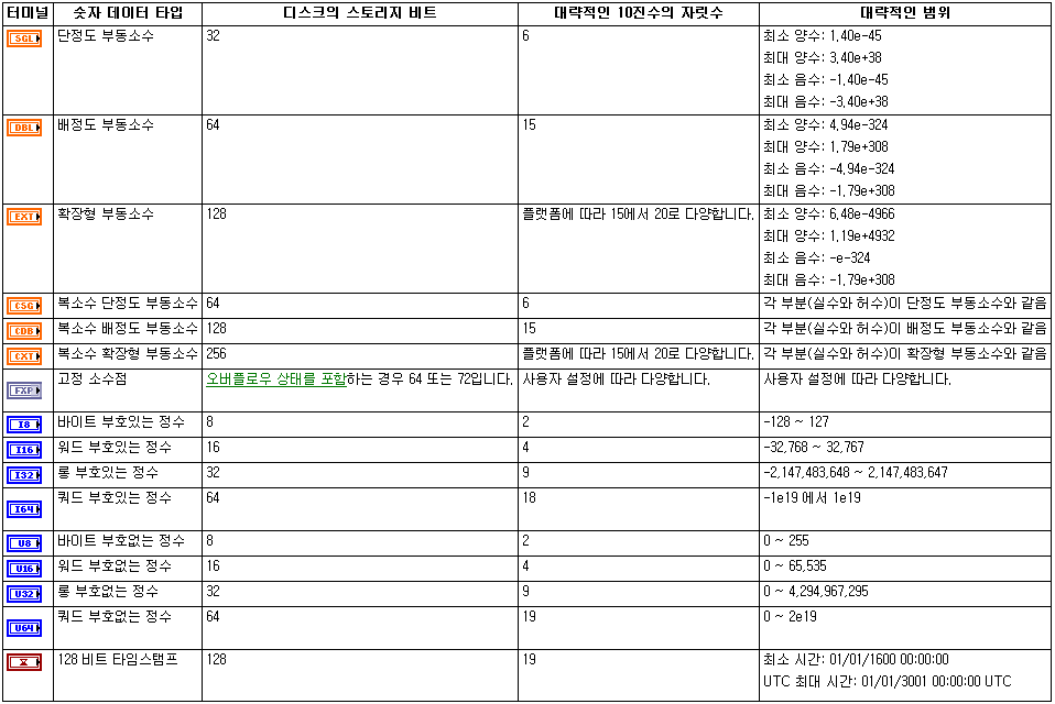소개글에서 대략적으로 설명을 했지만 LabVIEW 도움말에 나와있는 데이터형별 정보를 가지고 왔습니다.LabVIEW 도움말 : 데이터 타입 테이블